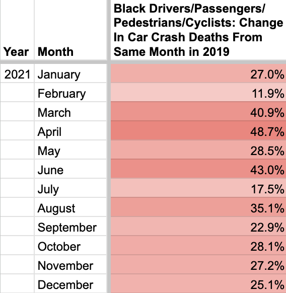 Worse outcomes for Black victims of car crashes unfortunately continued in 2021. Here are month by month numbers for car accident fatalities among Black people, comparing the month in 2021 to the same month in 2019.