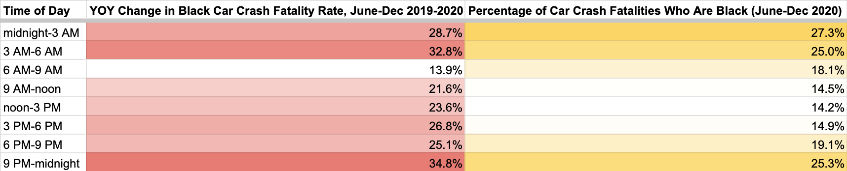 There was a double-digit increase in fatality rate for all hours of the day, but it was largest between 9 PM and 6 AM. Those are also the hours where car crash fatalities among African Americans are far higher than the Black share of the population in the U.S.