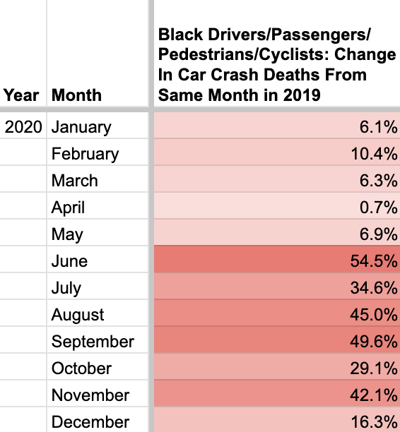 There were year over year increases (there were no decreases) in car crash deaths of Black people, for each month of 2020 relative to the same month in 2019: modest increases for each month between January and May (between 0.7% and 10.4% relative to the same month the year prior) and then a huge spike in June. The number of Black people killed in car crashes in June 2020 was an astounding 54.5% higher than the prior June.
