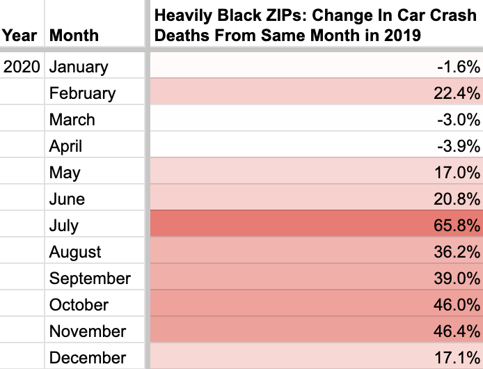 Here are the month by month changes in car crash deaths (with victims of any race) within majority Black ZIPs. The increases are similar to the changes in Black car crash victims: