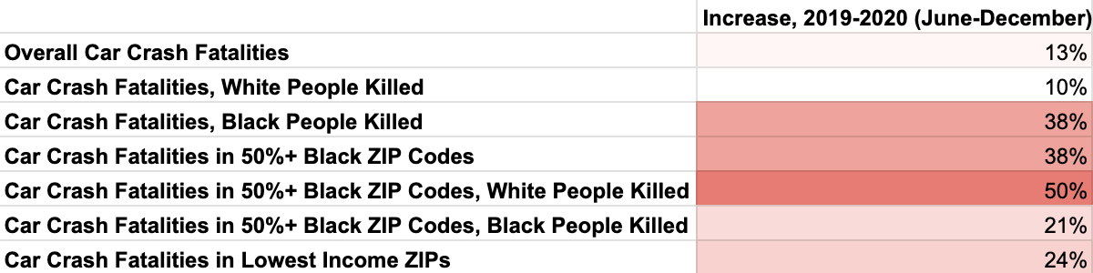 Overall, traffic fatalities increased by 24% in the lowest income ZIP codes for June-December 2020 compared to the year prior. The size of the increase was 36% in ZIP codes that are majority Black, 18% in ZIP codes that are majority white, and also 18% in ZIP codes that are majority Latino.
