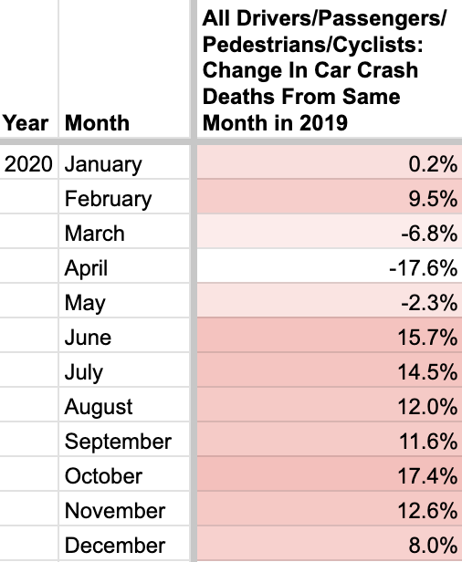 What about month by month fatality rate changes for all drivers comparing 2019 and 2020? There was a (likely Covid-related) dip in fatalities for the months of March through May, and then a much smaller increase starting in June: