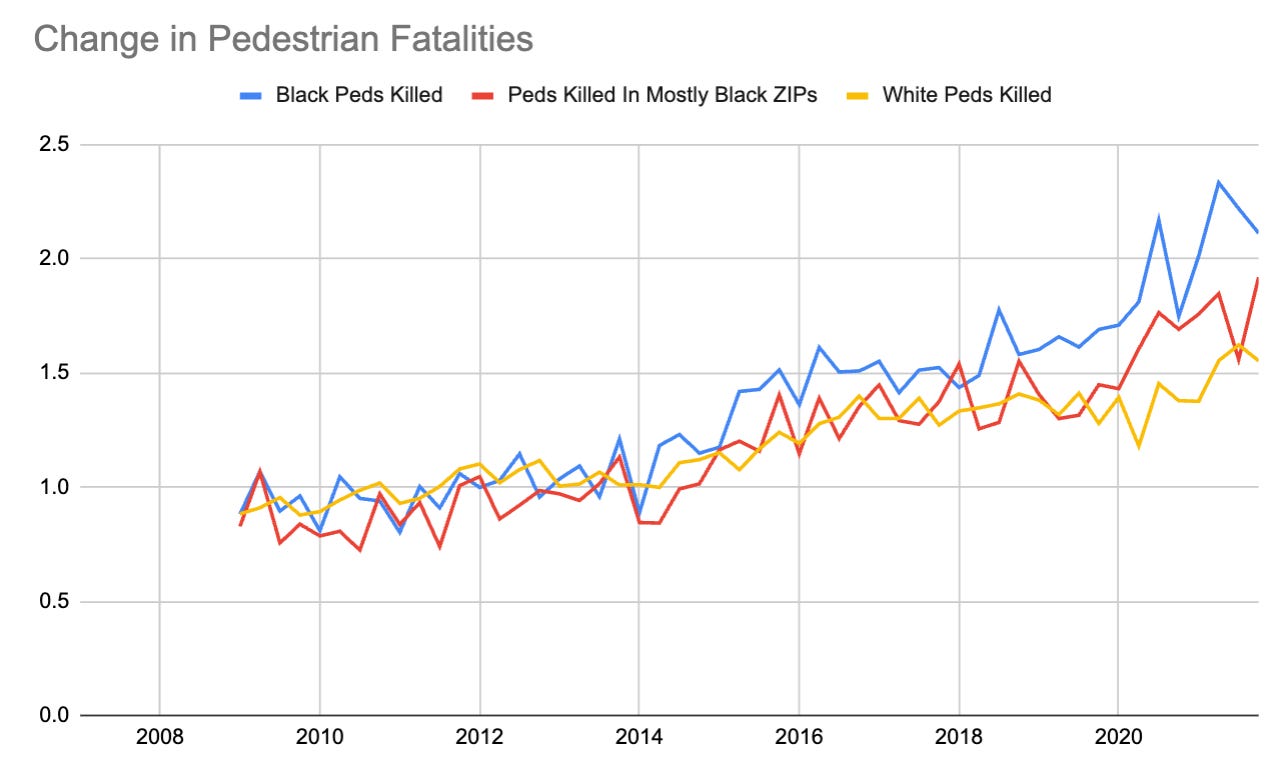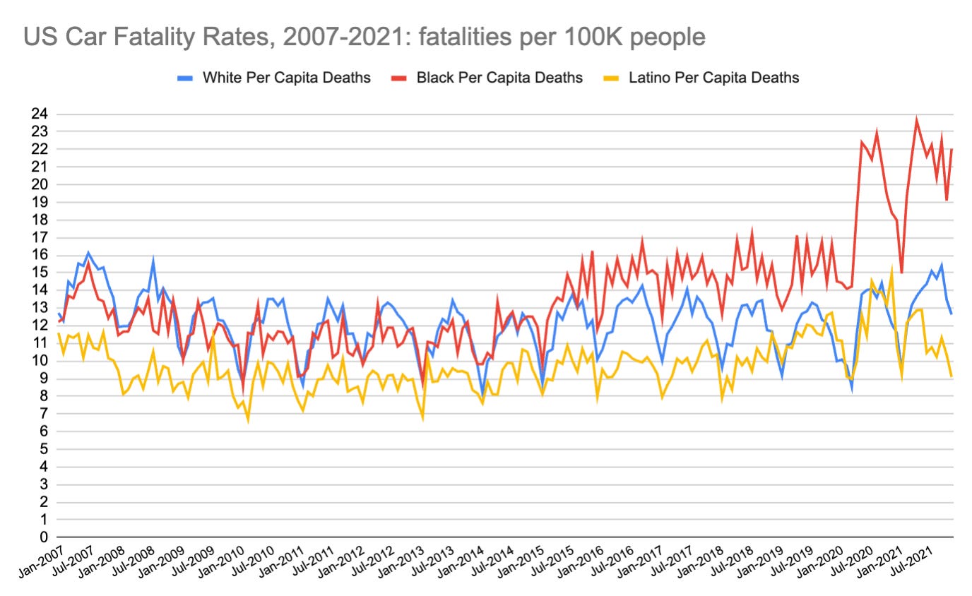 After I started writing about increasing numbers of pedestrian fatalities, several people reached out to ask me about whether there was an increase in traffic fatalities for African Americans starting in 2020. They noted some strongly worded tweets1 about Black traffic fatality and homicide rates going up after George Floyd was murdered. Here’s one graph that was shared: